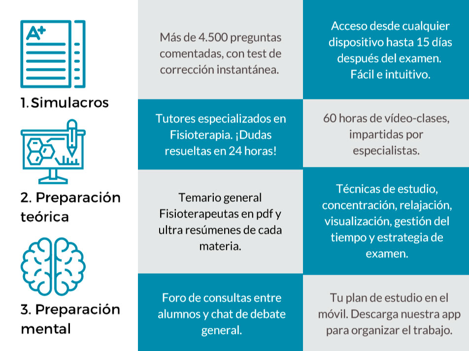 Nuestro curso de Simulacros OPE Fisioterapeutas 2020-21 trabaja con 45 exámenes específicos y más de 4.500 preguntas comentadas. Integra la práctica de simulacros para alcanzar un alto nivel de técnica test, preparación teórica y preparación mental.