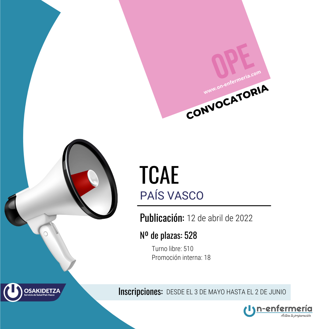 El Boletín Oficial del País Vasco ha publicado la resolución por la que se aprueban las bases específicas que van a regir la convocatoria OPE TCAE País Vasco-Osakidetza. Se ofertan 528 plazas en total (puestos funcionales de Auxiliar de Enfermería, Auxiliar Enfermería Salud Mental y Monitor/a Salud Mental) con destino en las organizaciones de servicios sanitarios del Servicio Vasco de Salud.