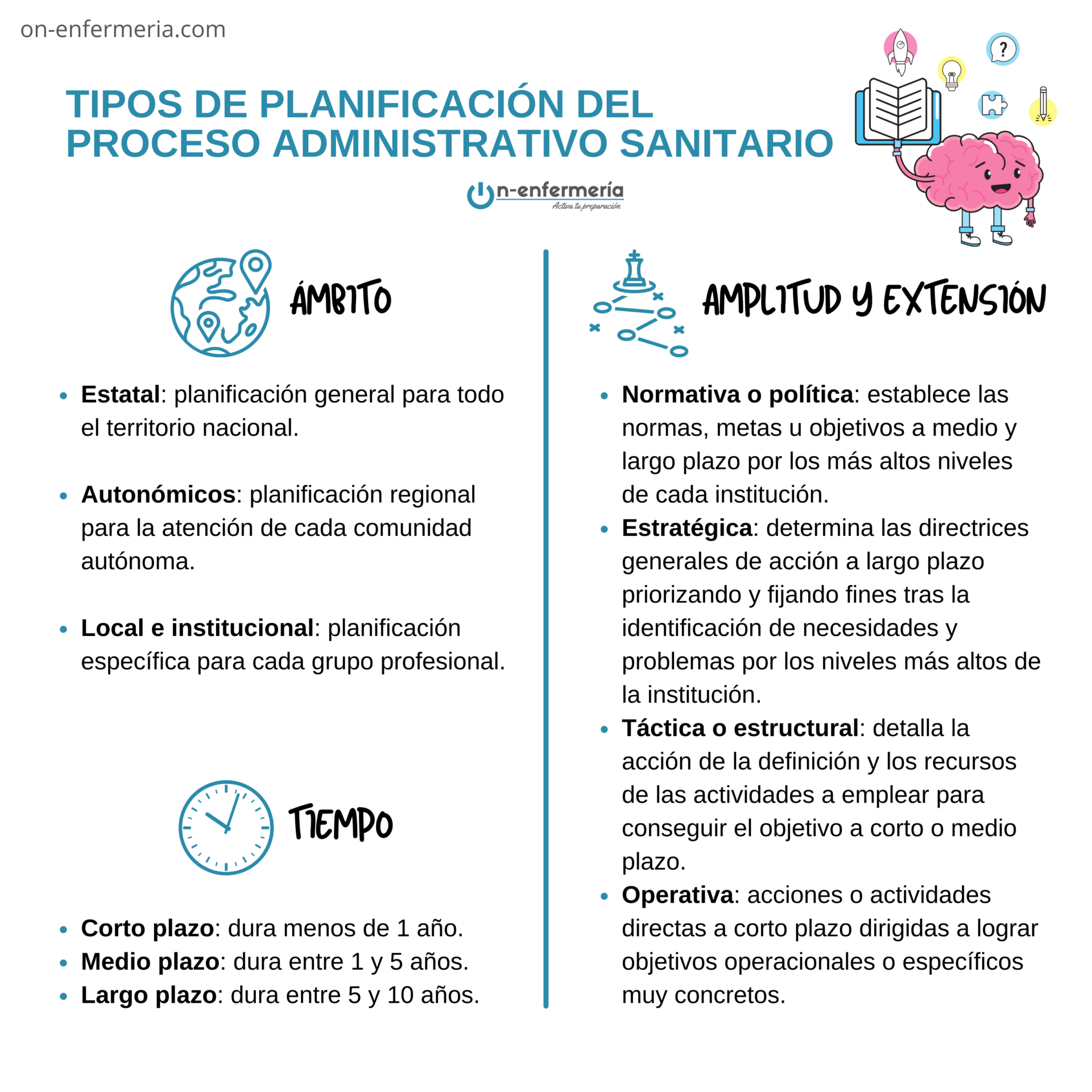 - Planificación: consiste en un proceso que, partiendo del análisis pasado y actual de la situación de un sistema y tras una evaluación de fines y medios, define objetivos a alcanzar, así como normas de ejecución y control de las actividades a desarrollar durante un periodo de tiempo determinado.