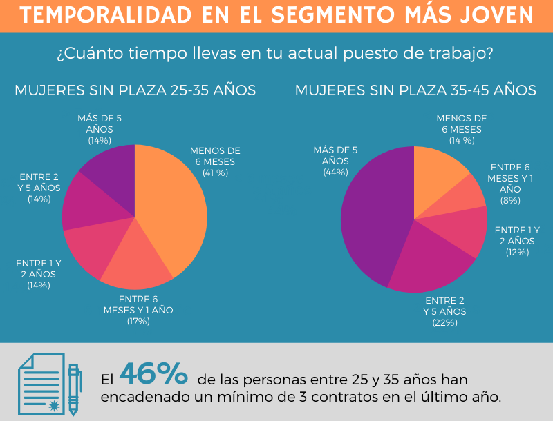 Un dato significativo es la elevada temporalidad en la horquilla más joven (25-35 años) de enfermeras sin plaza fija. Al ser preguntadas por el tiempo que llevan en su actual puesto de trabajo, un 41% responde que menos de 6 meses y un 17% que entre 6 meses y un año. Destaca también que el 46% ha encadenado un mínimo de 3 contratos en el último año.