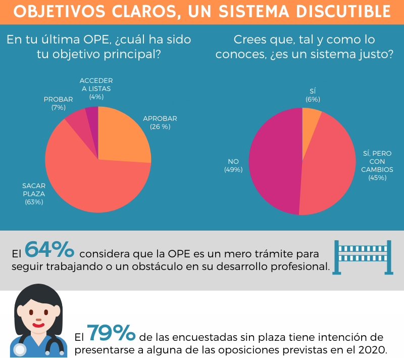 El objetivo último para las profesionales a la hora de presentarse a un examen oposición es evidente: estabilidad laboral. Un 63% afirma que sacar plaza, mientras que un 26% lo hace por aprobar, un 7% simplemente para probar y un 4% para acceder a las listas de contratación.