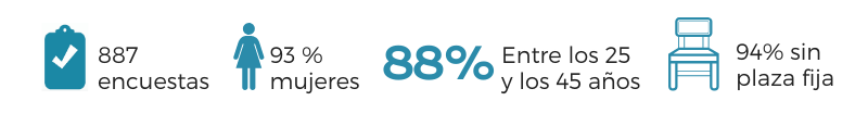 La encuesta, ha contemplado una muestra de 887 profesionales de la enfermería de todas las comunidades autónomas. El perfil del segmento en el que nos hemos enfocado engloba mayoritariamente mujeres (un 93%), con edades comprendidas entre los 25 y los 45 años (un 88% del total de encuestadas) y que en la actualidad no cuenta con una plaza fija (94%).