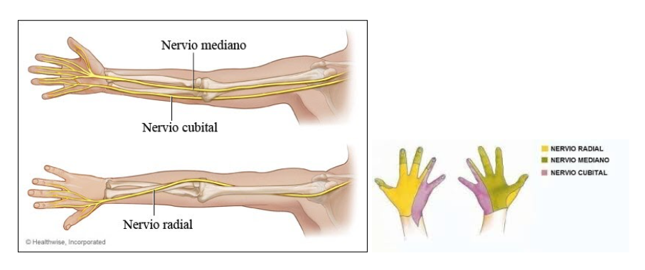 El nervio mediano es un nervio sensitivo – motor formado por la unión de las ramas de C5-C7, y la rama lateral de C8 a D1 del plexo braquial. Este inerva musculatura del antebrazo y mano. En el antebrazo inerva al pronador redondo, al palmar mayor y al flexor común superficial de los dedos. A nivel sensitivo tienen participación en la mano radial.